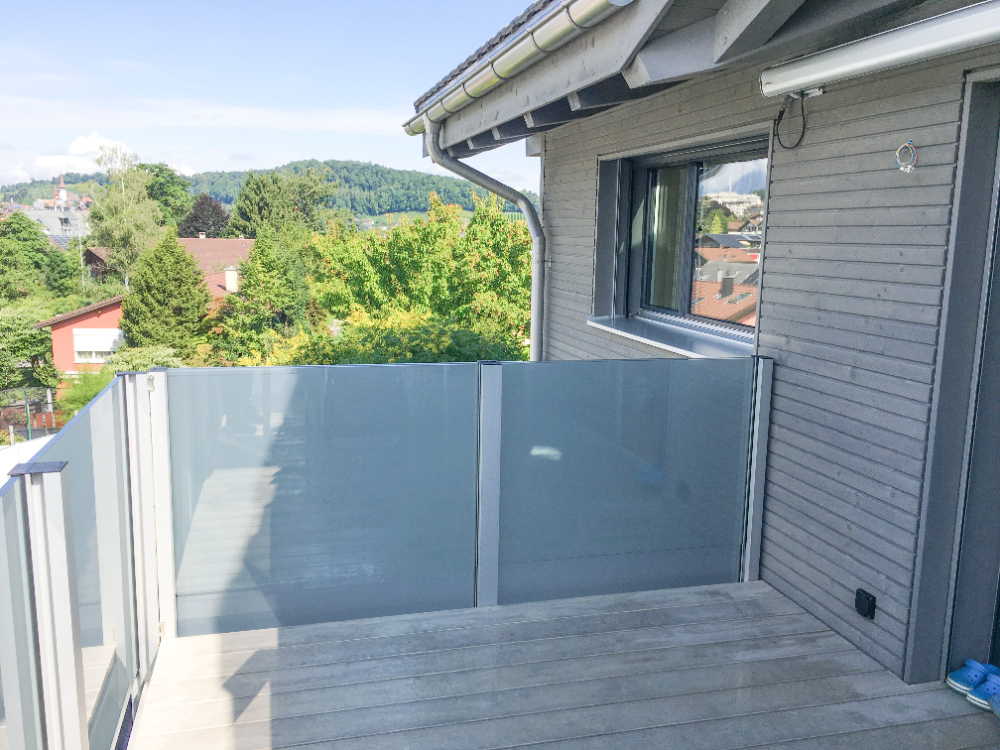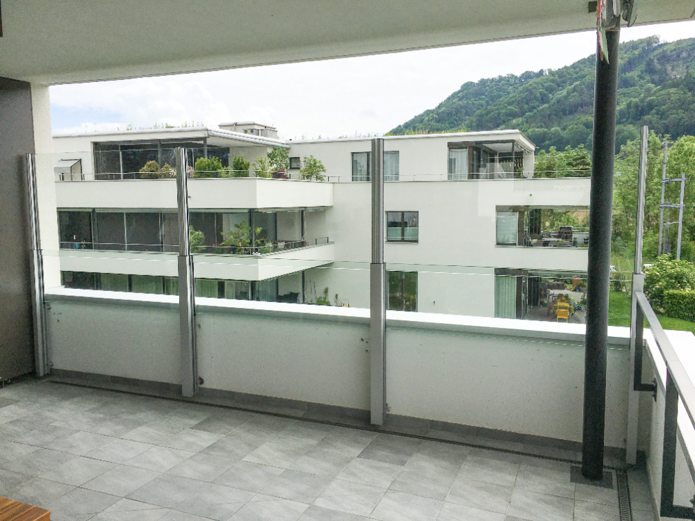 Mit einer Höhe von 1100 mm bietet das moderne Balkongeländer einen zuverlässigen Schutz. Wenn Sie einen besonders hohen Windschutz wünschen, empfehlen wir daher das mechanisch automatisch ausfahrbare Windschutzgeländer 20. Bei diesem Modell beträgt die Höhe bis zu 1.90 m. Das Glas wird in stabilen Profilen befestigt und geführt, damit Sie ein sicheres, patentiertes Balkongeländer mit Windschutz oder auch mit zuätzlichem Sichtschutz erhalten.